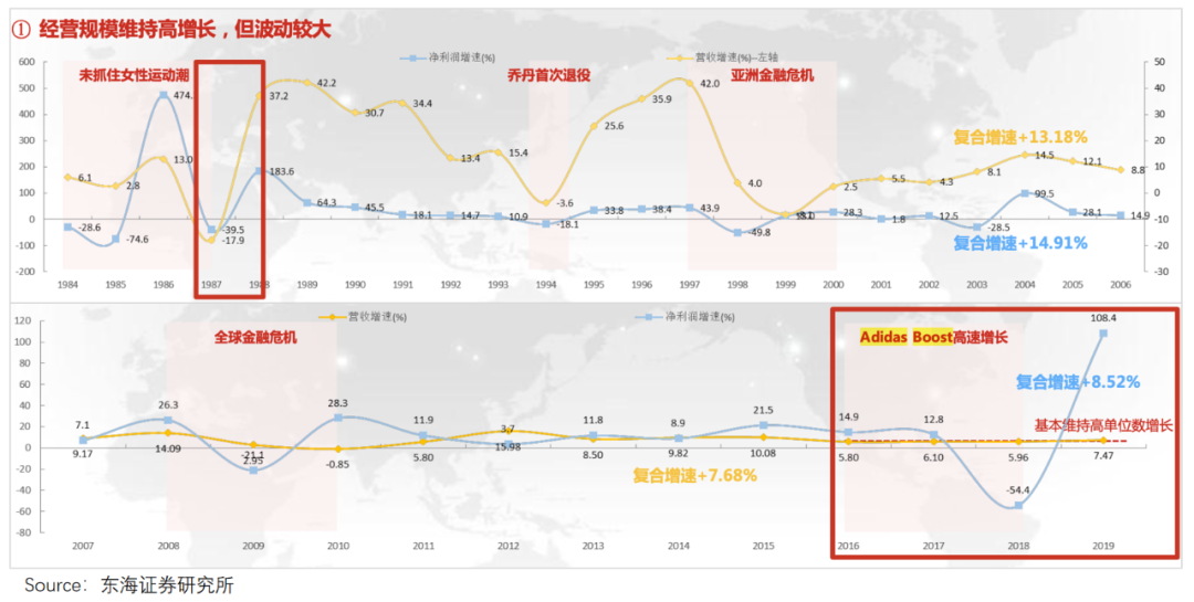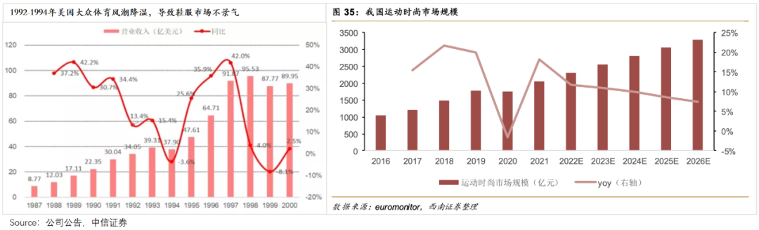 举例来说,1992-1994年,因美国大众体育风潮短暂性降温,导致运动鞋服市场整体不景气,行业增速降至低单位数。