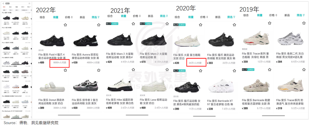 如下图,得物最新的FILA热度榜鞋前十中,2019年发布的鞋占到4款,2022发布的新品没有一个上榜。
