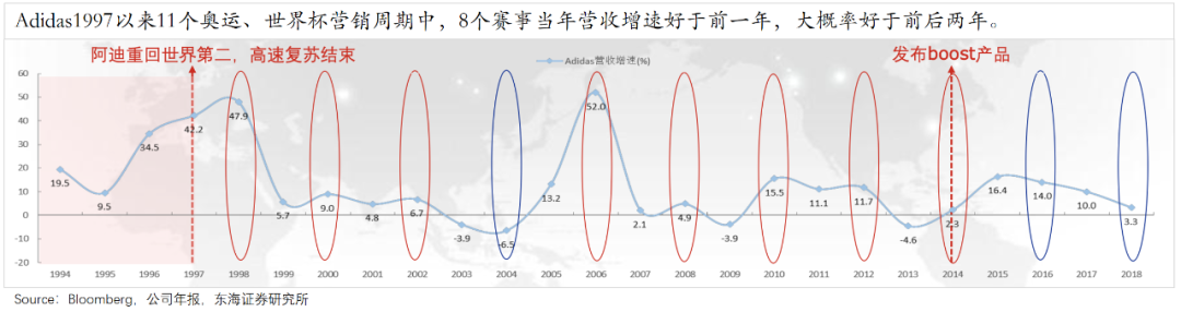 比如,世界杯、奥运会等大型体育赛事,就属于这样的资源。如下图,常年与顶级赛事合作的阿迪,基本能在赛事当年达到业绩小高峰。