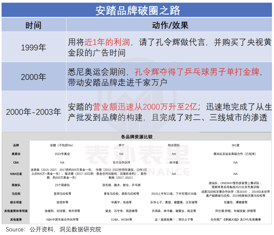 比如,安踏品牌CEO郑捷在采访中曾说道,“对安踏专业运动的背书,我们首先考虑的是体育资源。”