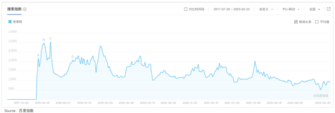 可以看到,从2018年开始,老爹鞋的百度搜索热度一直保持高位。