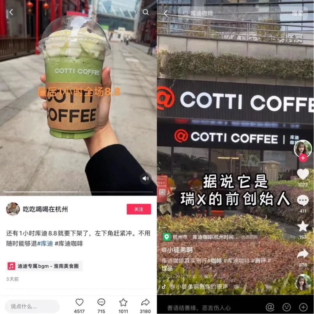 库迪团队也接触到一些本地吃喝玩乐方面的网红,让他们安利咖啡,吸引更多消费者去线下门店。比如在杭州地区,抖音拥有2.5万粉丝的“吃吃喝喝在杭州”、57.5万粉丝的“小徒弟啊”等专注杭州生活的网红,都做过库迪咖啡的推广。