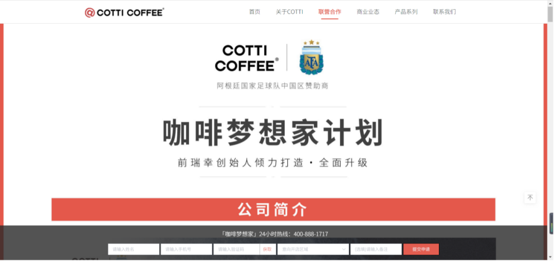 论画大饼的水平,一般企业真比不上新晋选手库迪咖啡。在公司官网的联营合作页面上,库迪提出“咖啡梦想家计划”,里面详细介绍了项目亮点、产品介绍、合作细节,最后甩上一个24小时热线,欢迎广大加盟商签约咨询。