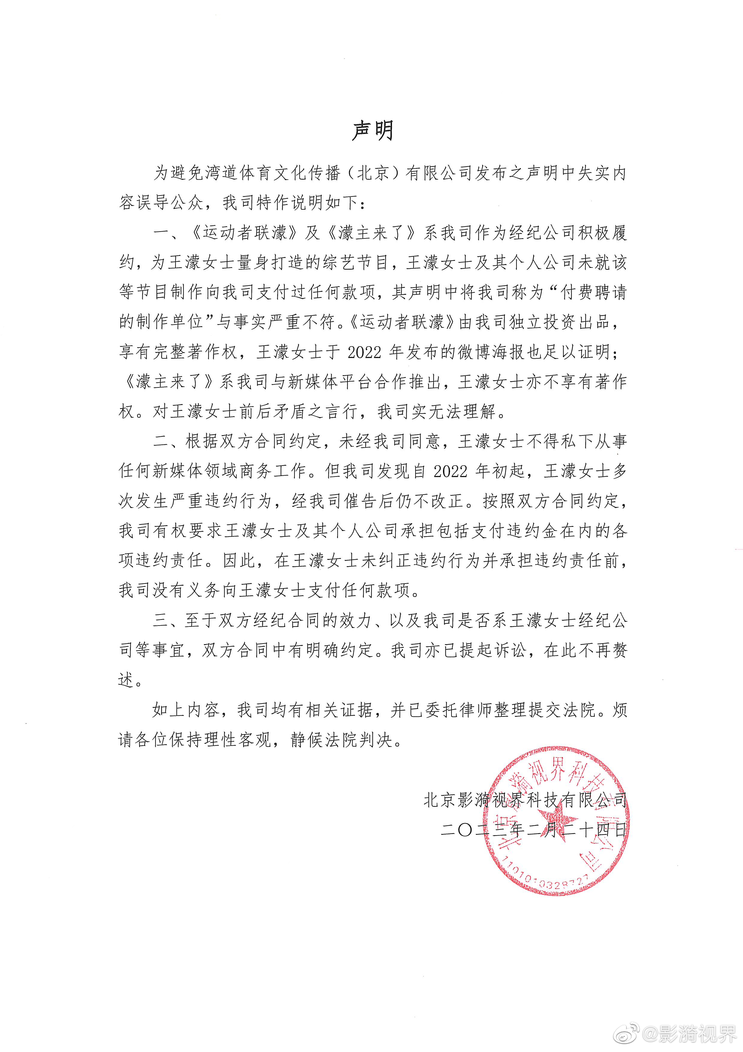 2月23日,王濛工作室声明指出,《濛主来了》《运动者联濛》均系王濛个人衍生IP,并非影漪视界为王濛打造的综艺节目;影漪视界与王濛合作已于2022年10月9日到期;影漪视界在与王濛女士的合作结束后,与王濛女士谈判续约未果,便拖欠应付款项;王濛女士名下公司拥有王濛个人独家经纪约,外界有任何其他经纪机构均为不实。声明还指出,王濛女士与影漪视界的纠纷已交由司法机关处理。