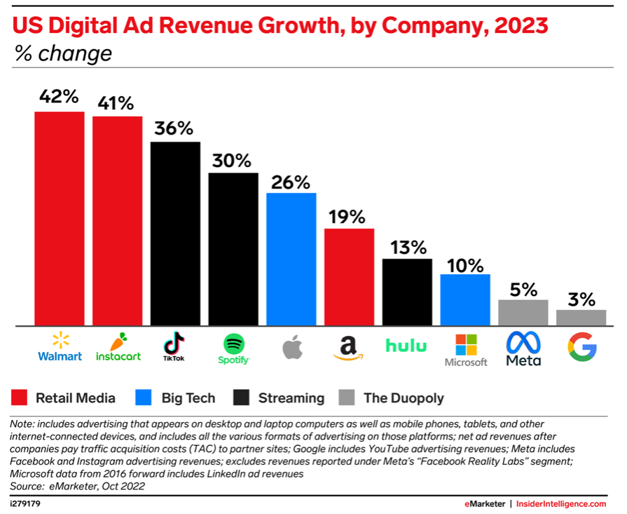 Insider intelligence预测,谷歌2023年在美国数字广告市场收入的增长率约为3%,在10家列出公司中垫底。增量已经难拓展,存量不能再任由对手分走。