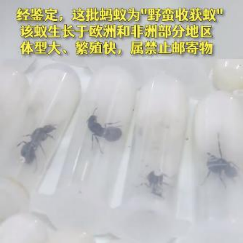 再比如,南京金陵海关在检查进境国际邮件时,发现一包裹藏有378只大号蚂蚁,收件人是一位异宠爱好者。经鉴定,该蚁为“野蛮收获蚁”,属禁止邮寄物,生长于欧洲、非洲部分地区,体型大、繁殖快、捕食积极且好战,若逸散野外将破坏本地农林生态、争夺本地蚂蚁生存资源。