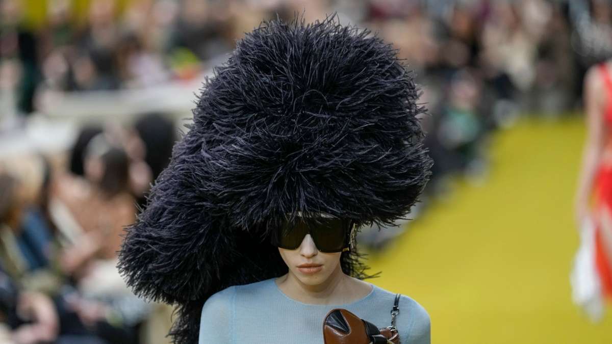 在其它造型上,包括一条在臀部用黑色膨胀绸缎装饰的裙装用粉色丝袜点缀,一条银光闪闪的披肩长袍搭配了带有科技感的墨镜,以及贯穿整个秀场的彩色皮菜,都是展现着浓郁的Alessandro Michele个人特色。