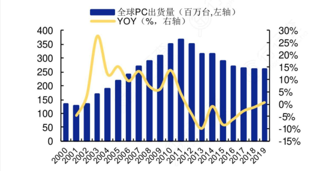 图/2000-2019年全球PC出货量统计,来源/Garter,安信证券研究中心