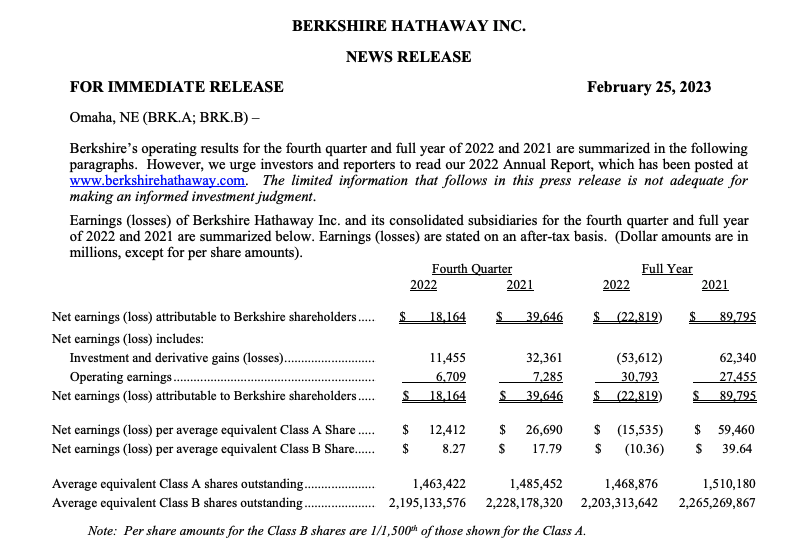 2月25日,巴菲特旗下公司伯克希尔-哈撒韦公布财报,伯克希尔-哈撒韦2022年净亏损228.19亿美元,上年同期盈利为897.95亿美元;第四季度净利润181.64亿美元,去年同期盈利396.46亿美元。