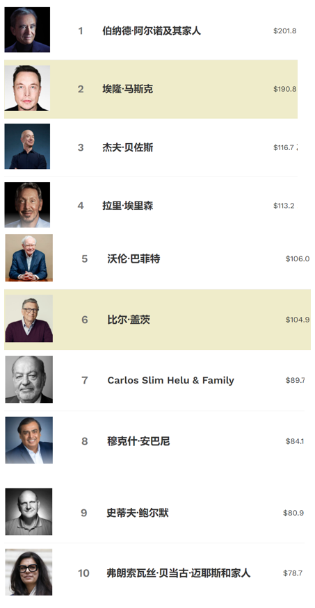 全球富豪榜(实时);单位:10亿美元;来源:福布斯