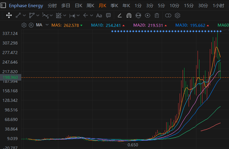 特斯拉等清洁能源公司的业绩和股价表现,比标准普尔500指数要超过100%。过去五年来,表现最好的三只股票都是专注于可再生能源领域。其中之一,全球第一“妖股”——Enphase Energy Inc.(纳斯达克股票代码:ENPH)的涨幅,已经从0.65美元最高涨到337美元,涨幅超过10000%。