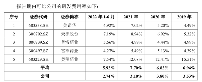 作为医药企业,想要加大优势,就必须注重研发。报告期内,海森药业的研发费用分别为942.02万元、1082.56万元、1206.82万元和580.1万元,占营业收入的比例分别为3.53%、3.8%、3.1%和2.74%。这远低于同行业6%-7%的平均水平。