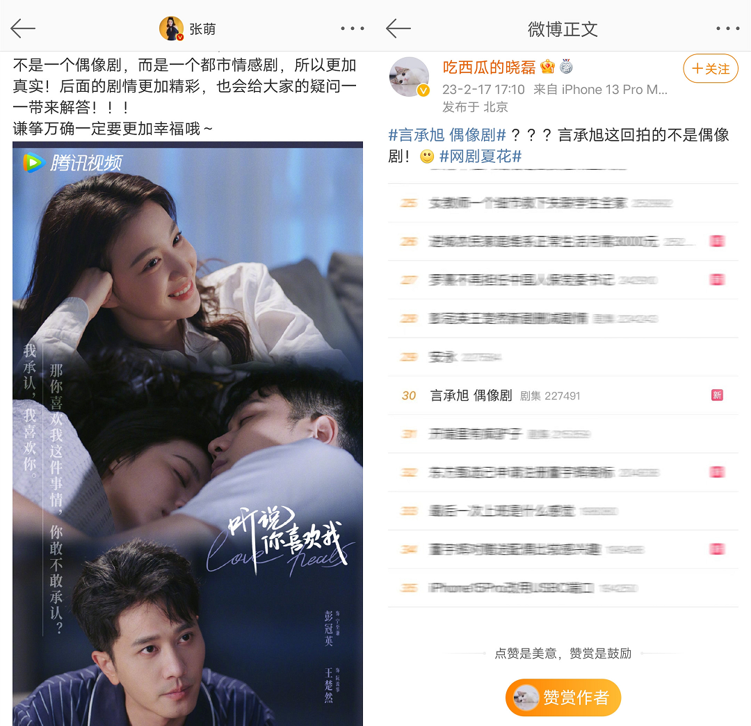 似乎无论网友是怎么亲切地称其为“现偶剧”,但在片方和平台的官方传播渠道中,“偶像剧”还是一种被逐渐弱化的说法。