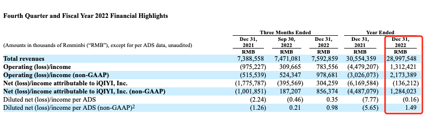 财报显示,2022年爱奇艺总营收达290亿,同比下降5%;非美国通用会计准则(Non-GAAP)下,公司的净利润为13亿元,上年同期为净亏损45亿元,首次实现全年盈利。