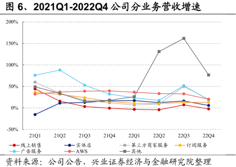 由于2022年前两个季度表现过于低迷,二级市场似乎对亚马逊零售业务不再抱有期待。从去年第四季度来看,亚马逊非云业务营收增速出现一定回升,甚至略超出市场预期。
