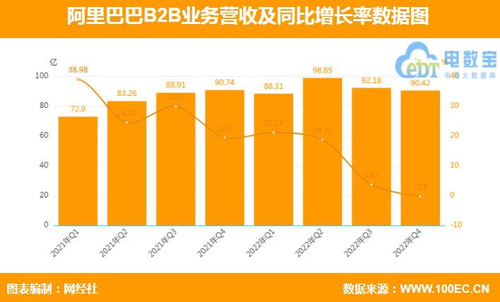 财报显示,2022年Q4阿里B2B业务(含中国商业批发1688和国际商业批发阿里国际站)共计实现营收90.42亿元,同比下降0.3%。其中,来自于中国商业批发业务1688的营收为人民币42.21亿元(约合6.12亿美元),与上年同期的42.31亿元相比基本持平。来自国际商业批发业务的营收为48.21亿元(约合6.99亿美元),与上年同期的48.43亿元相比基本持平。
