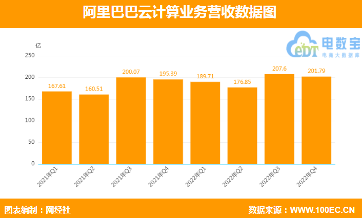 四季度,阿里云业务(含阿里云和钉钉)营收201.79亿元,同比增长3%。自2022年开始,营收在三季度首次突破200亿元外,该季度再次实现突破。在营收增速上,3%的同比增速是自2020年以来季度增速最慢,并呈现出逐季下降的势头。同比去年同期20%的增速下降17个百分点,环比上季度4%的增速也下降1个百分点。