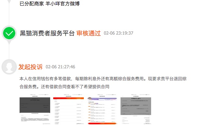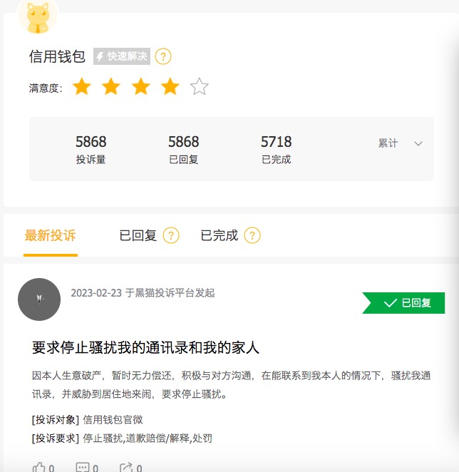 但因缺乏放贷牌照以及贷款业务的敏感性,截止目前,信用钱包和羊小咩在黑猫投诉的累计投诉量均十分惊人。其中,信用钱包已经达到5868个,大量涉及暴力催收、高利贷等问题。