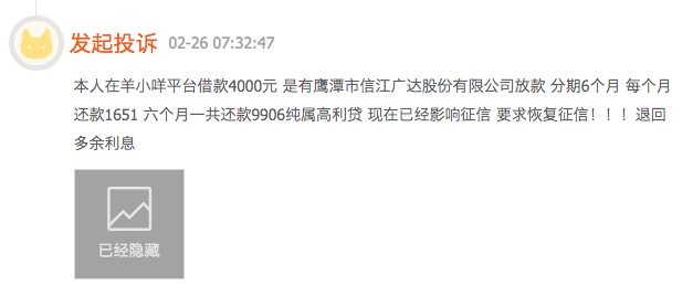 而一名羊小咩用户提到,放款公司为鹰潭市某公司,借款6个月,每月还款1651元,纯属高利贷。新经济观察团调查发现,该公司名为鹰潭市信江广达小额贷款股份有限公司,注册资本5亿元,涉及6000多个司法案件,都为借款合同纠纷,大量案件涉及量化派旗下的信用钱包。
