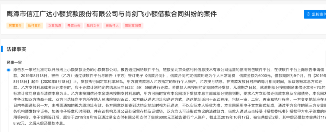 例如,在《鹰潭市信江广达小额贷款股份有限公司与肖剑飞小额借款合同纠纷的案件》中,该公司于北京众信利民信息技术有限公司运营的信用钱包软件平台,借款人借款金额为6000元,借款期限为9个月,贷款执行固定年利率36%。就逾期部分按照剩余未偿还本金×1%的标准计收罚息。而北京众信利民信息技术有限公司即为量化派主体量子数科科技有限公司的曾用名。