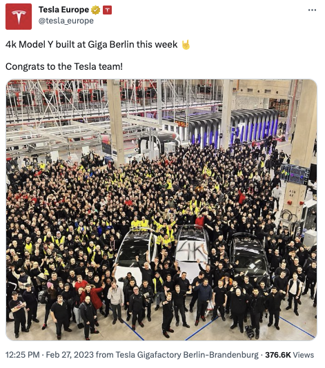 北京时间2月27日,特斯拉欧洲官方推特发布消息称,德国柏林超级工厂Model Y周产量突破4000辆。据悉,柏林超级工厂于2022年3月22日开业,ModelY周产量在6月中旬达到1000辆,10月初达到2000辆,12月中旬达到3000辆。