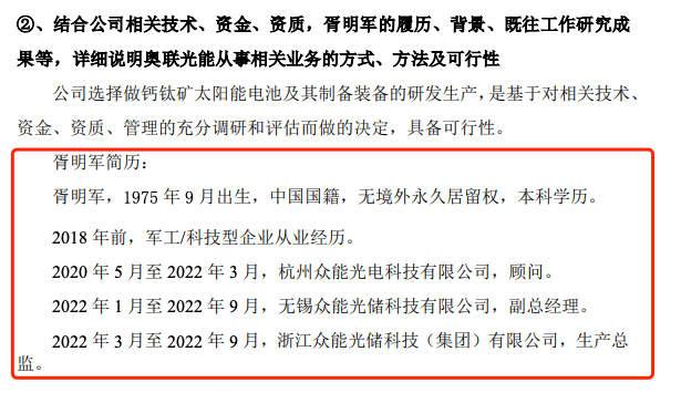 当时奥联电子的公告中,胥明军一直作为钙钛矿技术的关键人物被介绍。公告称胥明军专注于钙钛矿太阳能电池技术研究,对钙钛矿电池研发进程和产业化过程有独到的理解与实践能力,在钙钛矿技术产业化所需要的材料配方、工艺研发、装备研制等领域具备核心竞争能力。