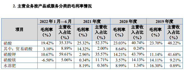 而从其主营产品来看,2022上半年硝酸毛利率为19.42%,创报告期内新低。硝酸镁在报告期内首次出现毛利亏损的情况。