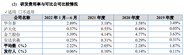 同期,迪尔化工研发投入占营业收入的比例分别为0.11%、0.14%、0.1%、0.06%,而同行业可比上市公司研发费用率平均值(研发费用占当期营业收入的比例)分别为1.87%、2.28%、2.05%、2.22%。