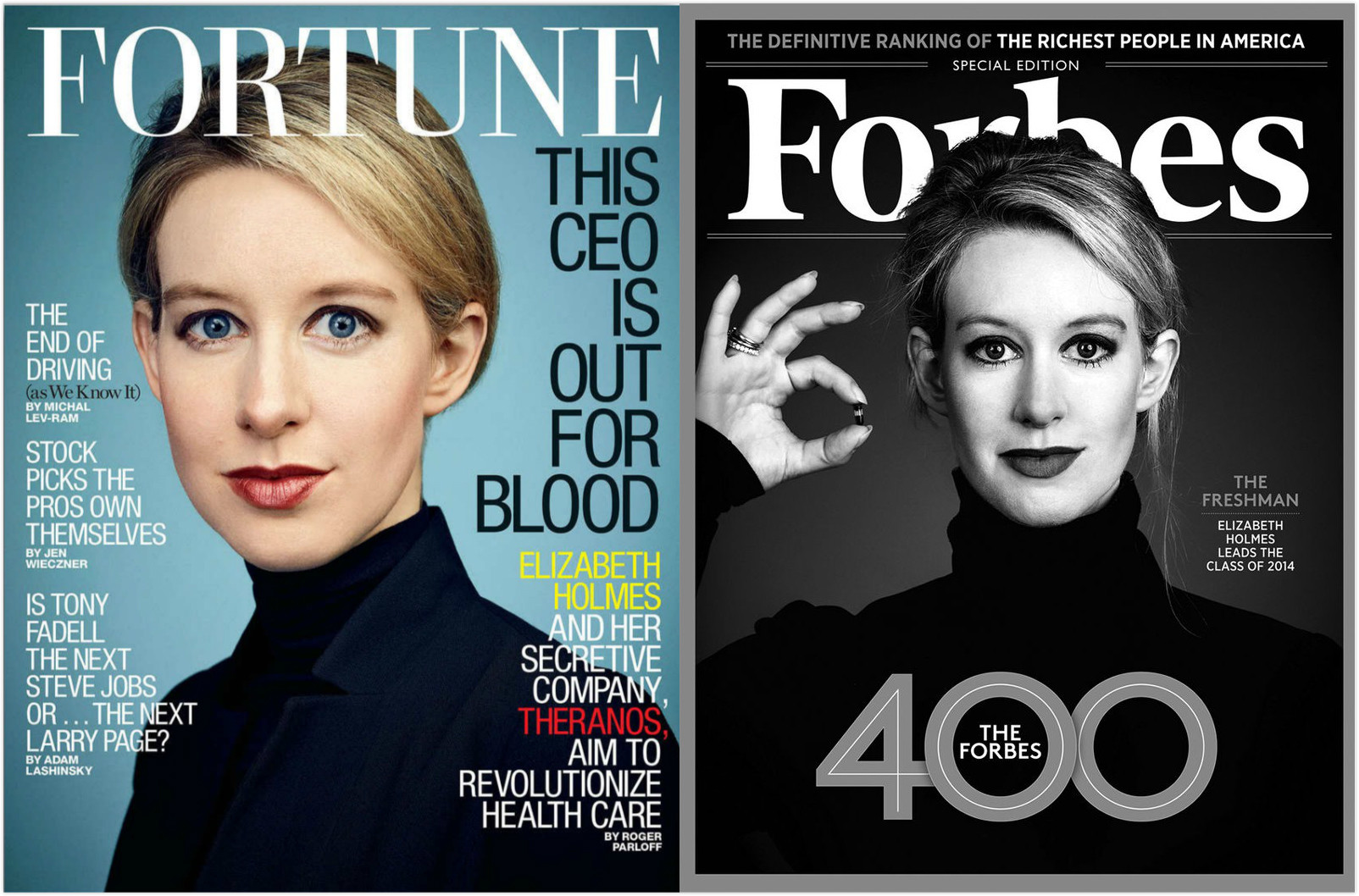 而且,她就像乔布斯一样,对“讲故事”有着不知疲倦的重视。她的故事告诉人们:Theranos 的目的不是要生产出某款紧俏货,也不是要回报投资人,而是要刺破现实。曾经在采访中,霍姆斯不止一次地申明,利用Theranos的先进技术,仪器只需从被测者的指尖抽取一滴血就能完成对上百种疾病的检测。这是一项令人惊呼的创新,不但能拯救千万人的生命,而且能“改变世界”。在如今这个各类App烂大街的科技界,霍姆斯堂吉诃德般的雄心博得了满堂喝彩。她登上了《财富》、《福布斯》和《公司 Inc》等期刊的封面,成了《纽约客》和著名脱口秀主持人查理.罗斯的专访对象,身价更是曾一度暴涨至 40 亿美金。