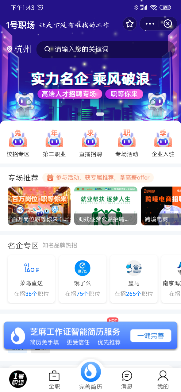 1号职场支付宝小程序界面截图