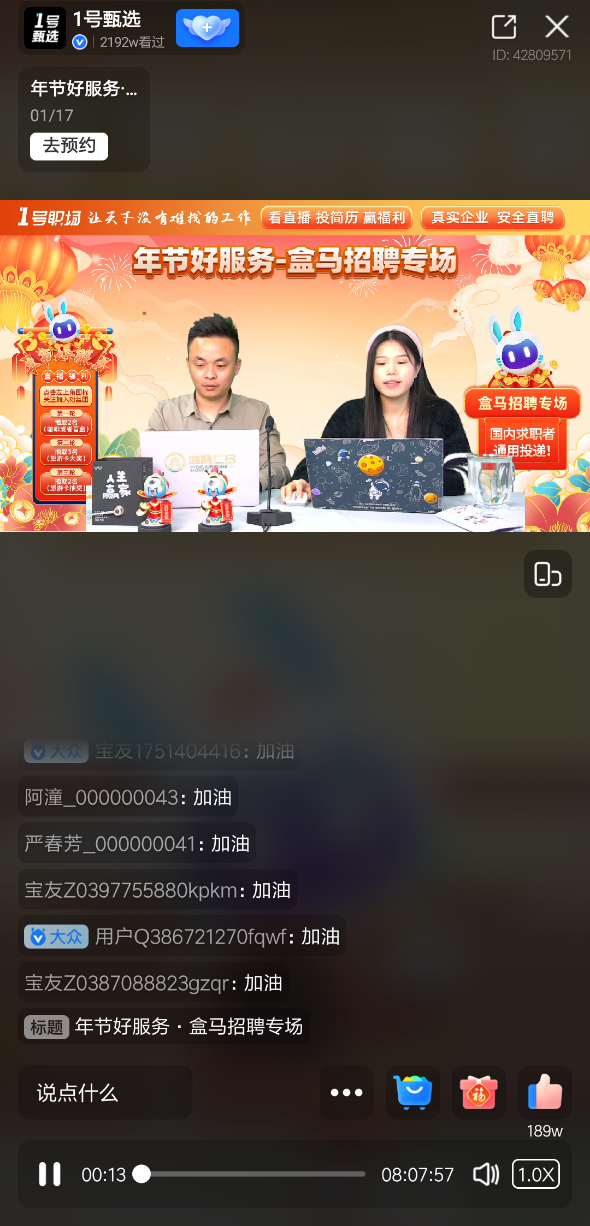 1号职场就曾用极低的成本尝试在支付宝上做招聘类直播,并取得了一场直播最高2000万观看的成效。