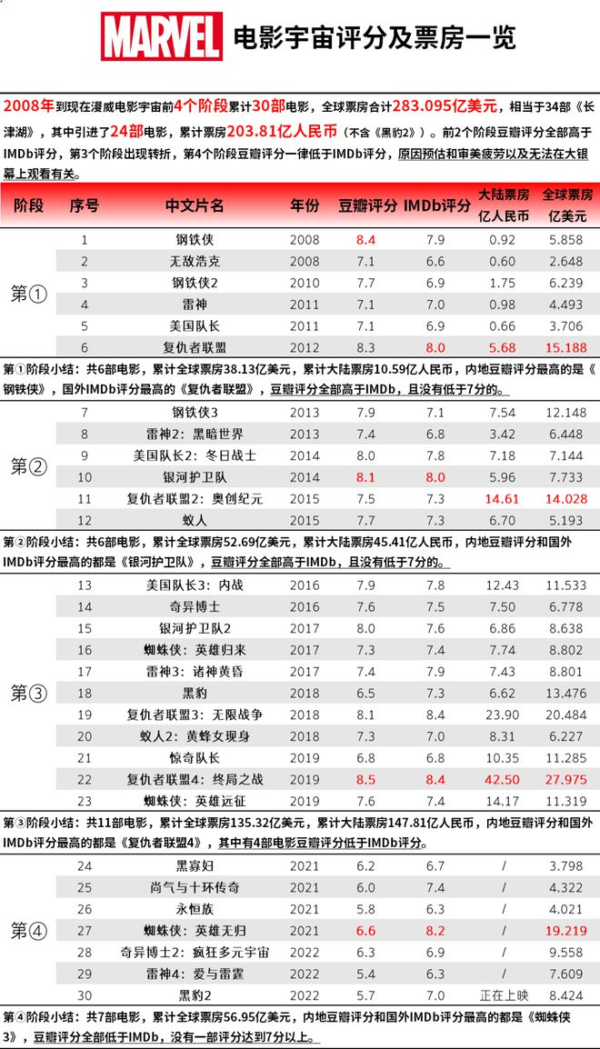 漫威失灵,原因是复杂多方面的,既有其第四阶段自身质量下降的因素,同时也与过去三年半,漫威阔别中国导致粉丝流失、中国影迷观影热情下降有关。不难看出,整个第四阶段豆瓣评分、IMDB评分均有下滑,前者下滑更严重,三部不及格,唯一可圈可点的是19亿美元+的《蜘蛛侠:英雄无归》。