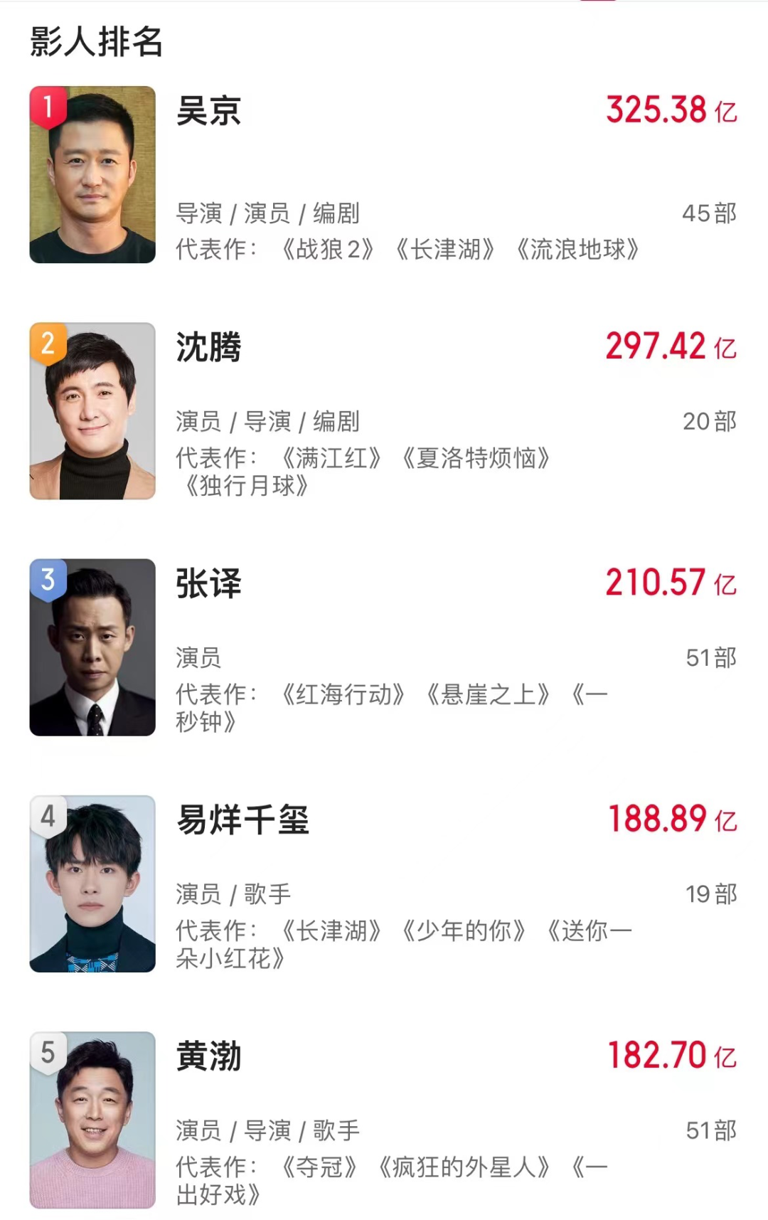 正如前面所说,在2015年左右,黄渤作为演员达到了巅峰,是罕有的具有国民认知度的演员。伴随着后面的转型,慢慢又被观众所遗忘。在这个时间里,吴京、沈腾等人的崛起,在慢慢取代黄渤的位置。尤其是伴随着通货膨胀和市场的快速增长,吴京、沈腾都赶上了这股红利,在票房上完成了快速的反超。