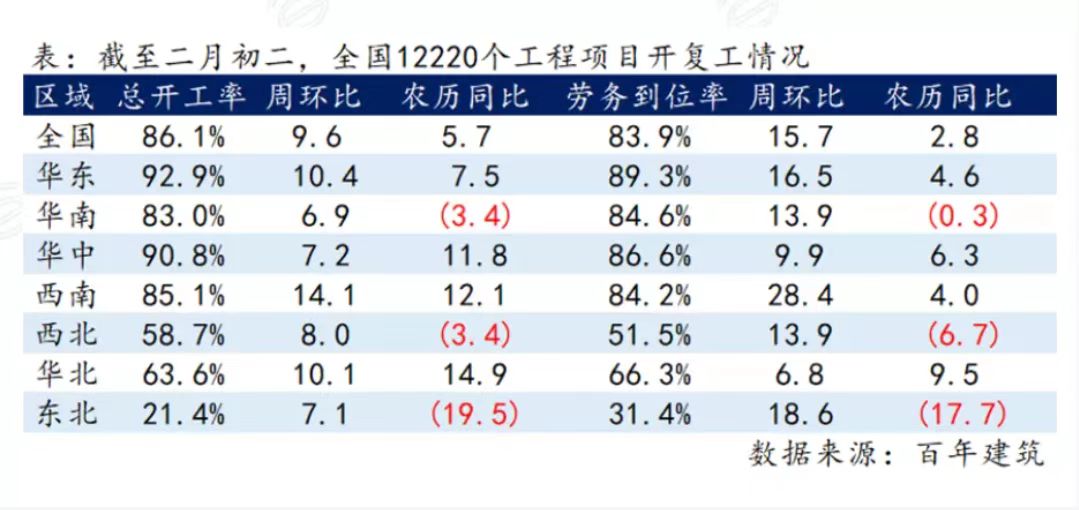 据百年建筑网调研,截至2月21日(农历二月初二),全国约1.22万个工程项目开复工率达86.1%,周环比提升9.6个百分点,农历同比提升5.7个百分点;劳务到位率83.9%,周环比提升15.7个百分点,农历同比提升2.8个百分点。