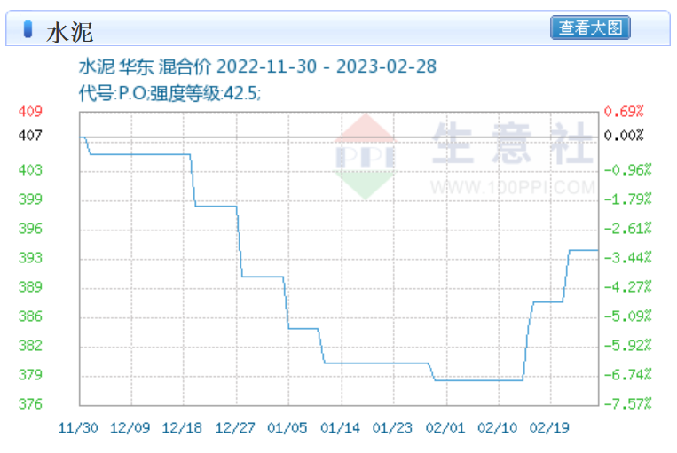 2月28日,生意社水泥基准价报394元/吨,较日前低值上涨了约4%。