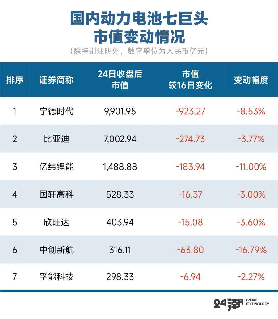 据24潮团队统计,在17日-24日这短短6个交易日中,宁德时代、比亚迪、亿纬锂能、国轩高科、欣旺达、中创新航、孚能科技等7家企业市值全线下跌,市值合计蒸发1484亿元,降幅达7%,而同期上证指数上涨0.56%。其中,降幅最大的动力电池企业中创新航、亿纬锂能市值降幅均在10%以上。