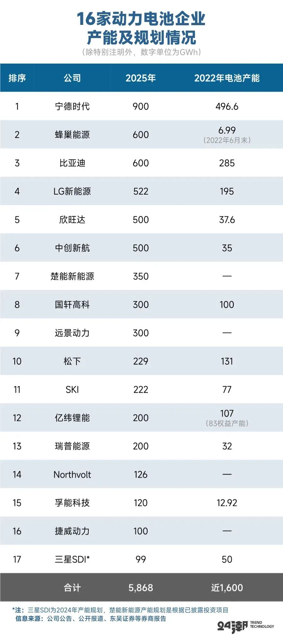 比如24潮团队统计,综合各券商及企业公告等数据发现,全球17家动力电池企业预计到2022年底产能合计将近1600GWh,仅这17家动力电池企业到2025年产能规划高达5868GWh。这近乎是2022年全球动力电池总需求量的11.33倍,且远高于上述需求预测!