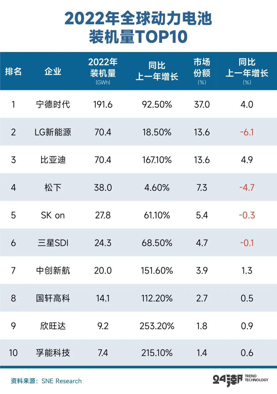 在国内,宁德时代的市场份额更是从2021年的52.1%跌落至48.2%。而比亚迪、中创新航等市占率则有所提升,其中,比亚迪2022年市占率相比2021年提升了7.25个百分点。