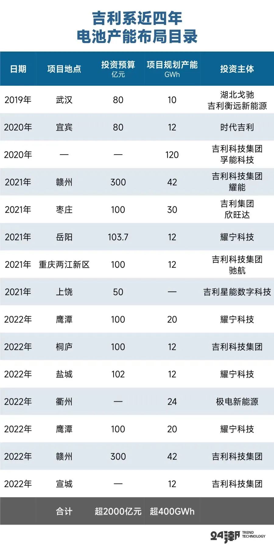 比如据24潮不完全统计,近4年间吉利系对外至少公布了15个重大投资规划,动力电池产能规划超400GW,总投资预算超2000亿元。此外,诸如广汽集团、上汽集团等汽车产业巨头也都投入百亿资金入局动力电池。