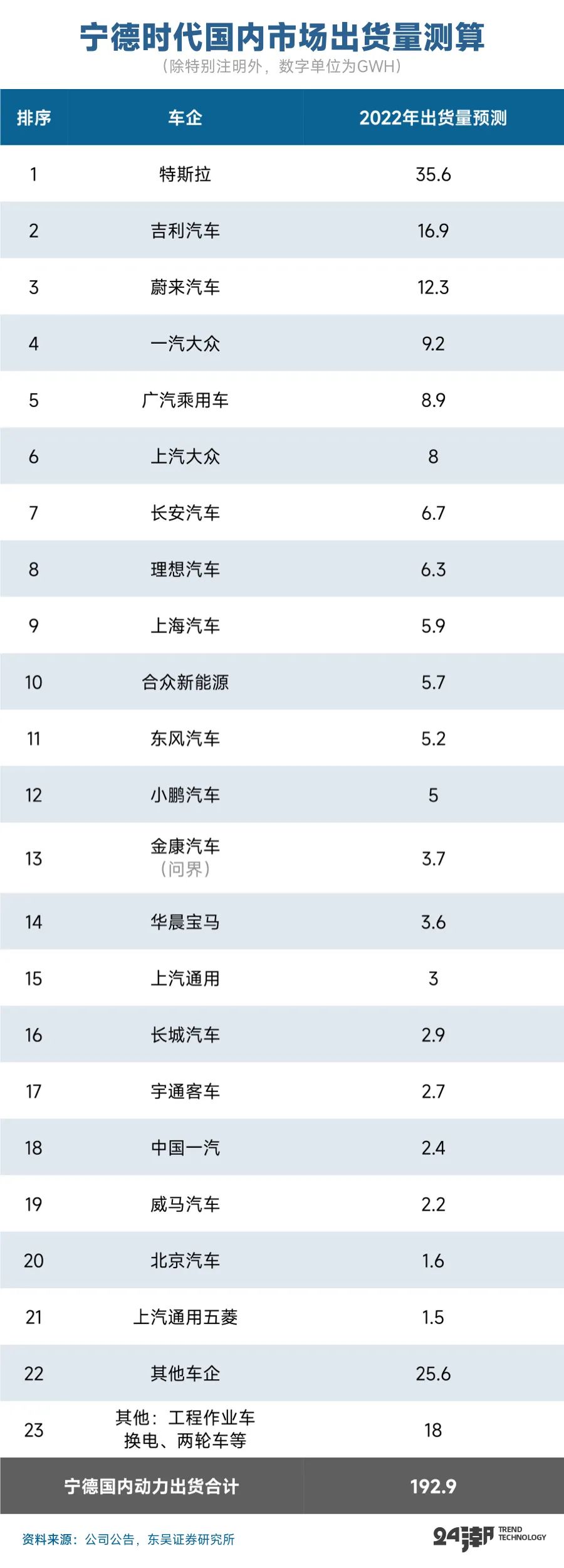 根据东吴证券测算,2022年前十大客户销量约占宁德时代国内市场的60%,而其中前三名、特斯拉、吉利汽车与蔚来汽车,都已有自己的动力电池扩张计划。