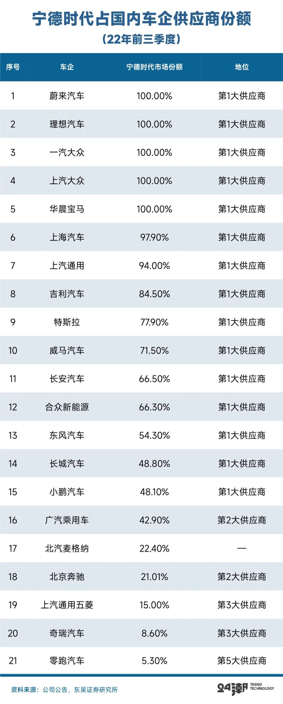 此外,据24潮统计,在2022年前三季度宁德时代的21个主要客户中,宁德时代只在8个客户中供应商份额占比超过80%,在另外8个客户中份额占比已低于50%。
