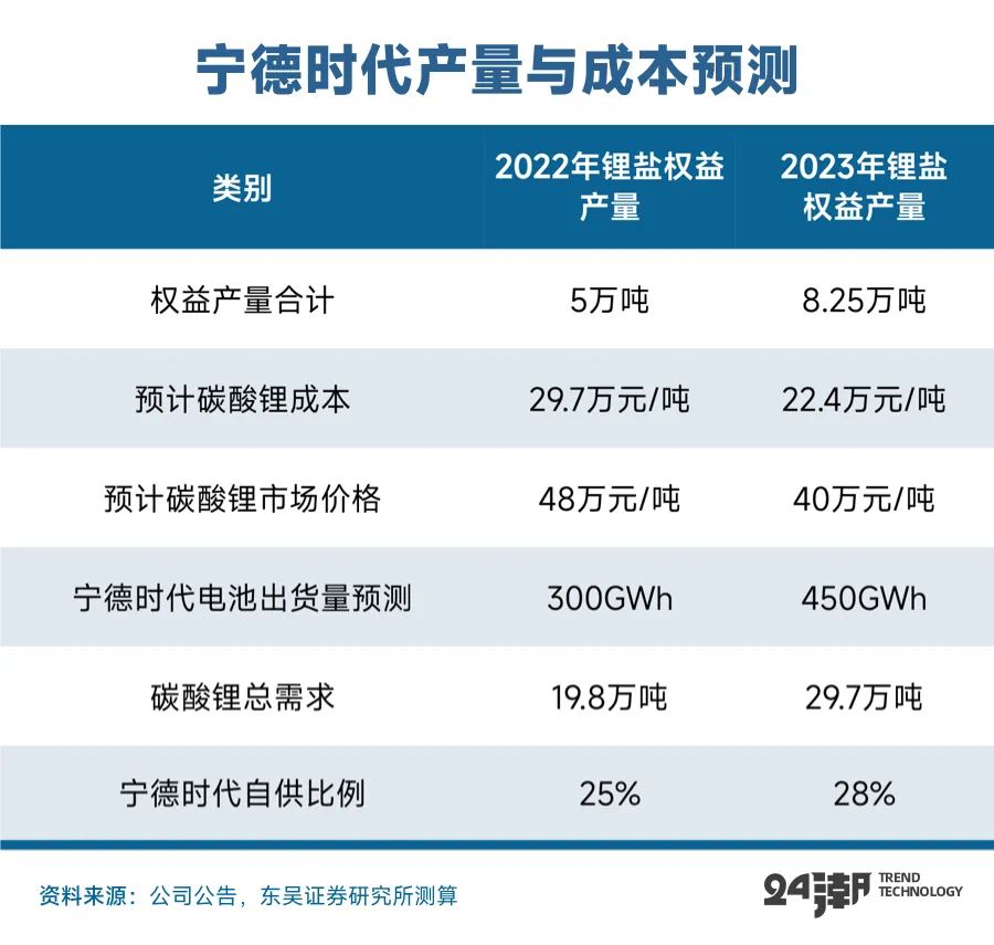 比如根据东吴争取测算,到2023年宁德时代碳酸锂权益产量约为8.25万吨,而宁德时代自身碳酸锂总需求约为29.7万吨,自供比例仅为28%。