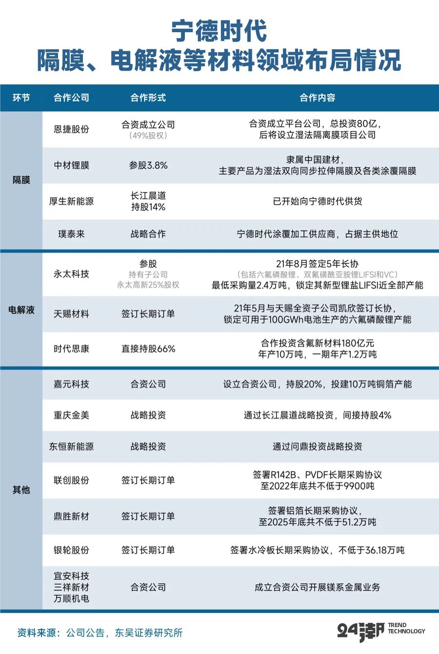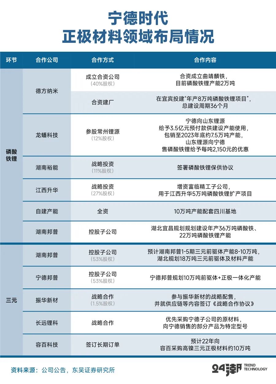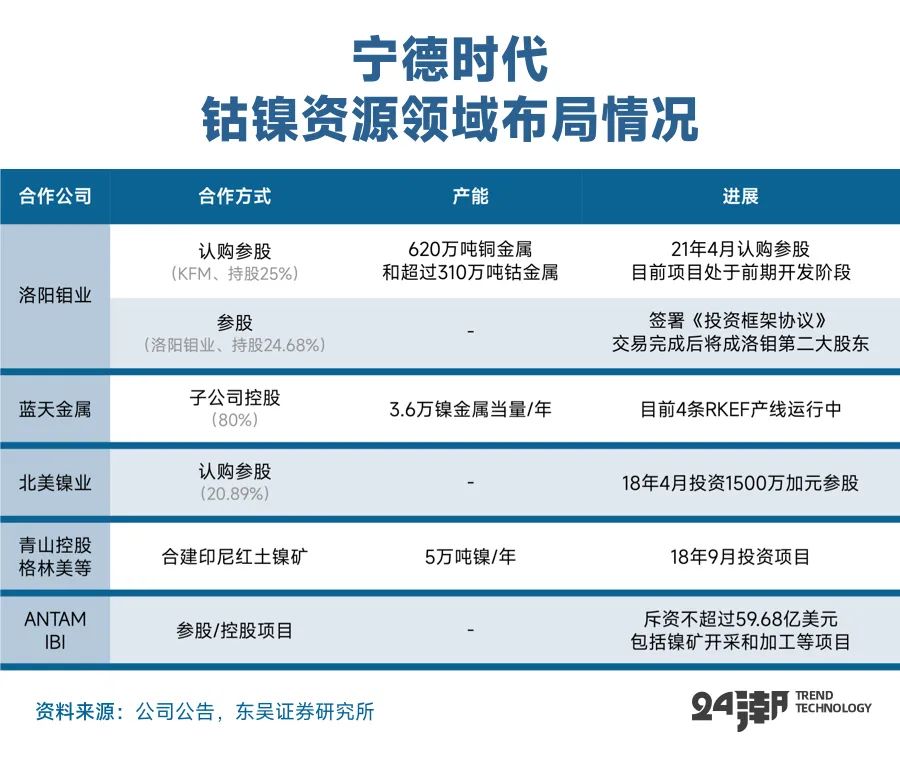 事实上,这与宁德时代在上游布局及进度有很大关系。据24潮统计,近些年宁德时代在锂资源领域的投资已超百亿规模,有券商分析认为,宁德时代在上游锂资源的系列产业布局,对应300GWHh+电池需求,远期规划庞大,有效保证供应链安全。