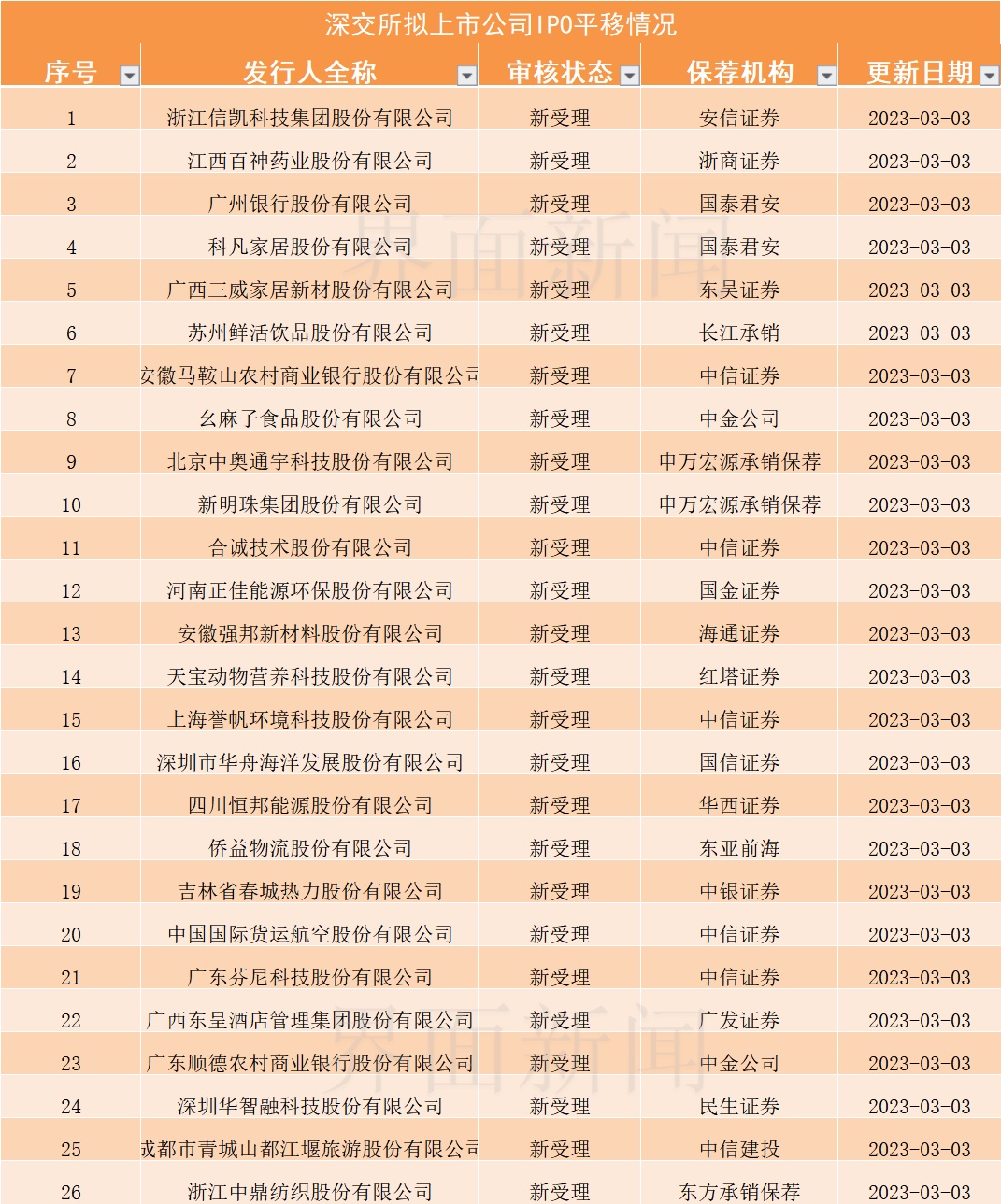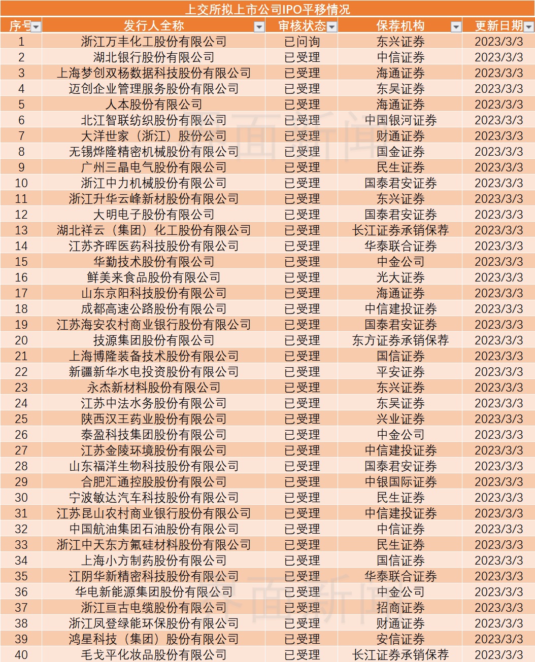 值得注意的是,3月3日是沪深交易所接收主板在审项目申请截止日,当天两市平移企业出现明显“井喷”。其中,上交所受理平移企业共40家、深交所26家。自3月4日起,沪深主板将开始“纳新”,接收新申报企业的申请。