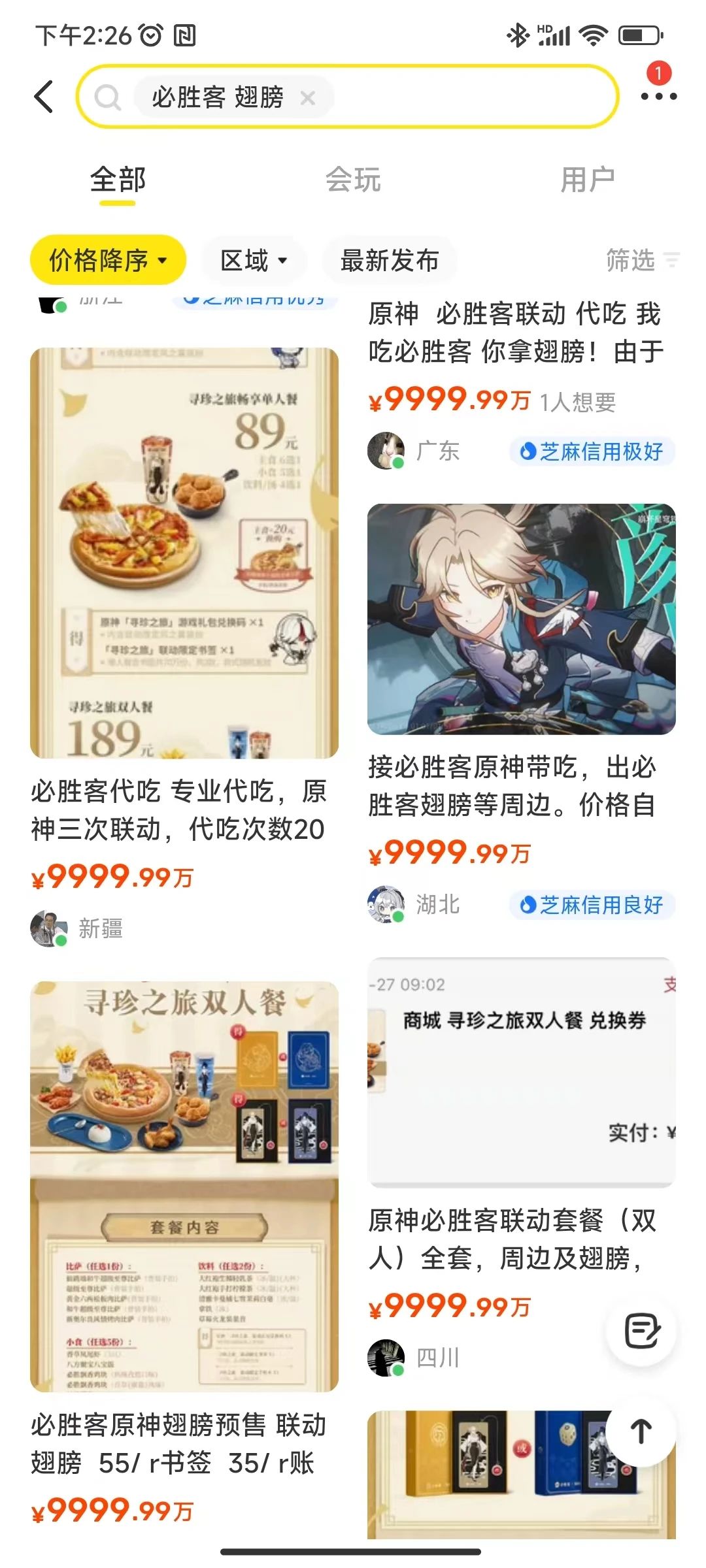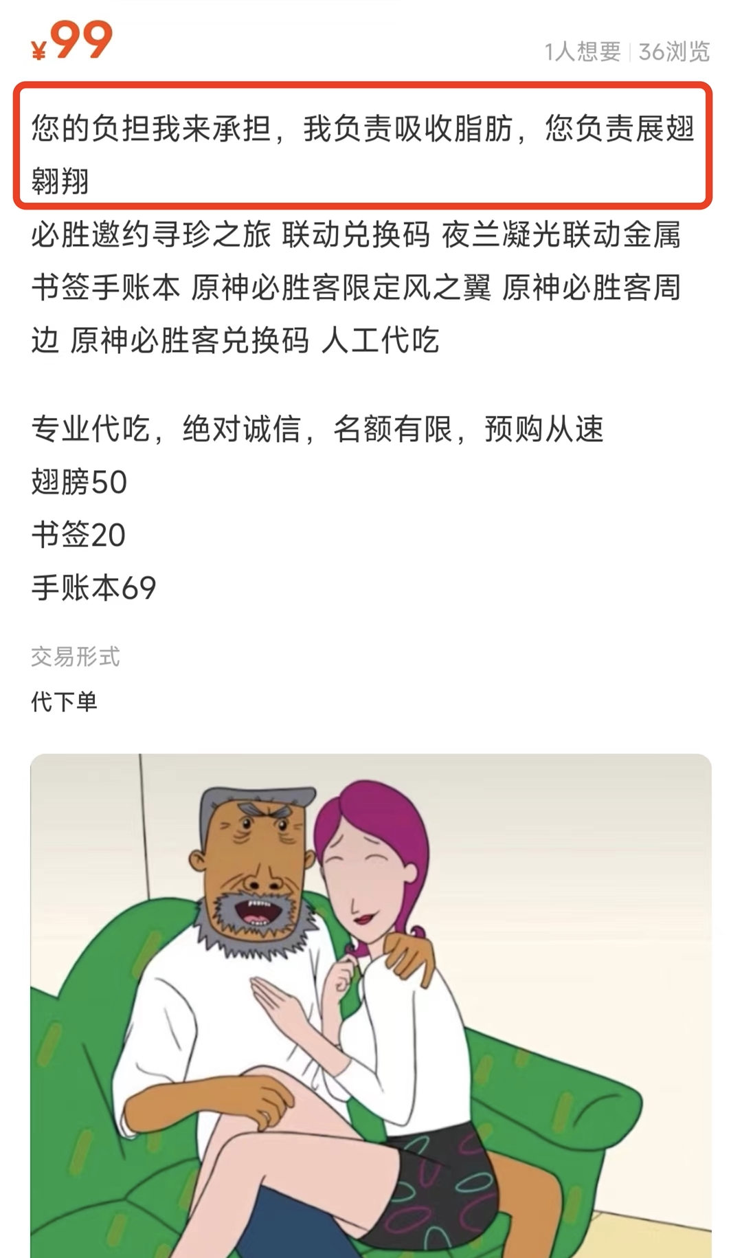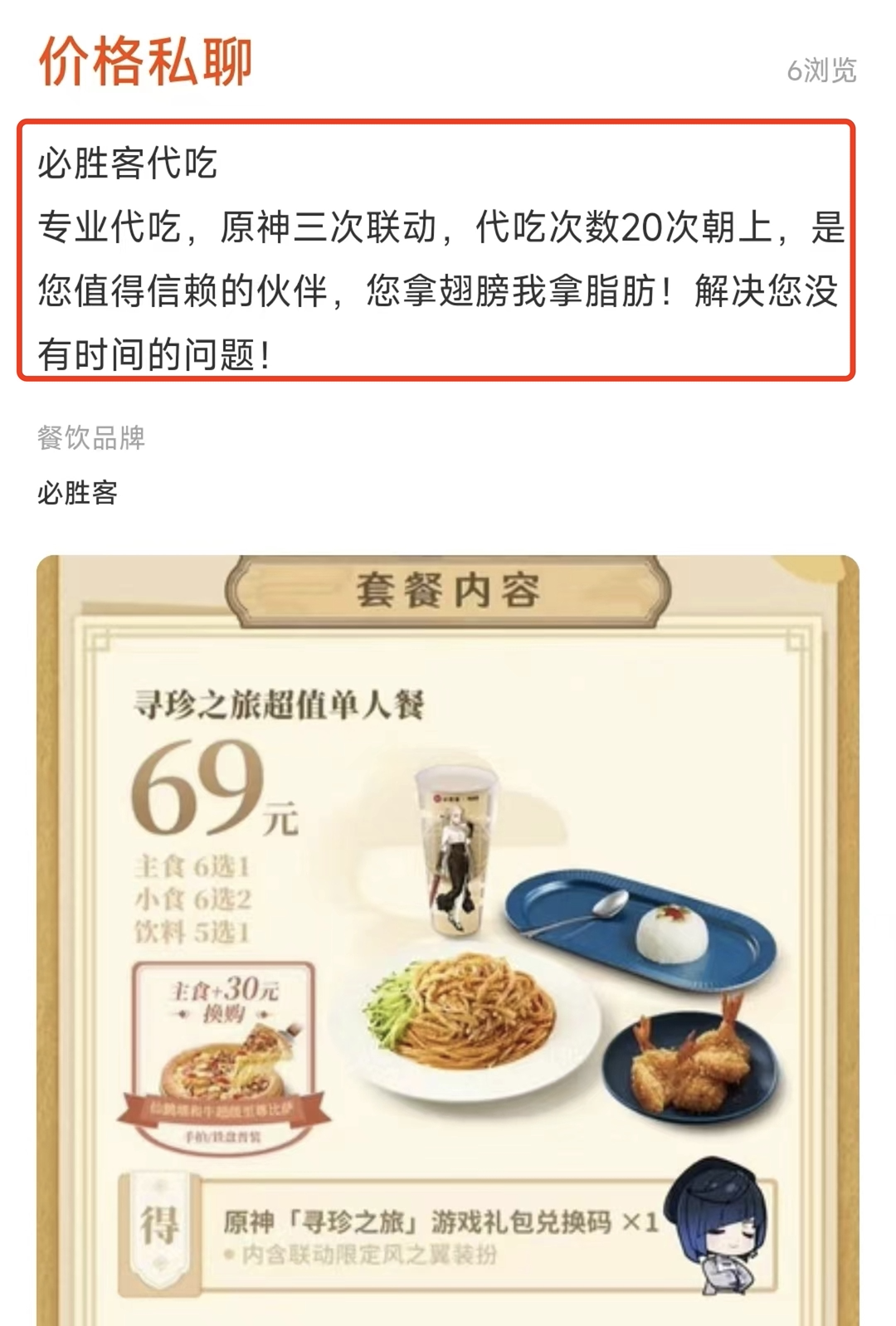 还有不少卖家把价格标到9999万,一位自称“必胜客专业代吃,原神3次联动,代吃次数20次朝上,您拿翅膀,我拿脂肪,解决您没有时间的问题”。