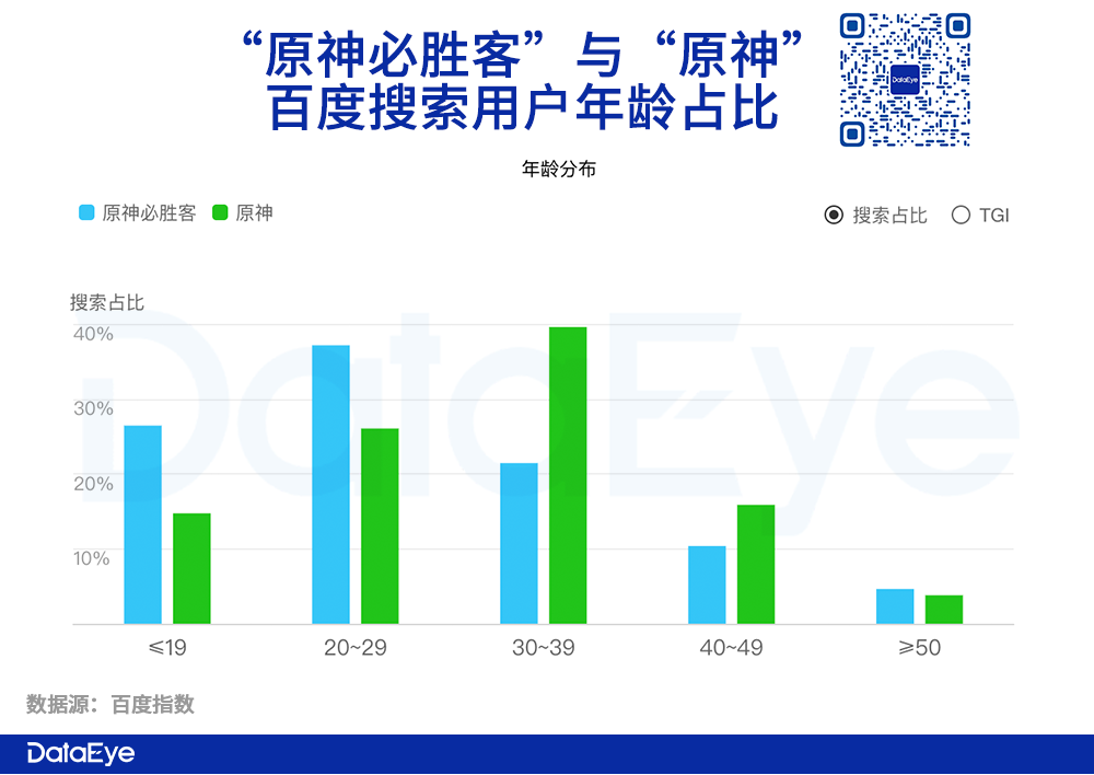 也就是说,相比“原神”的搜索者,“原神必胜客”的搜索者更加年轻。