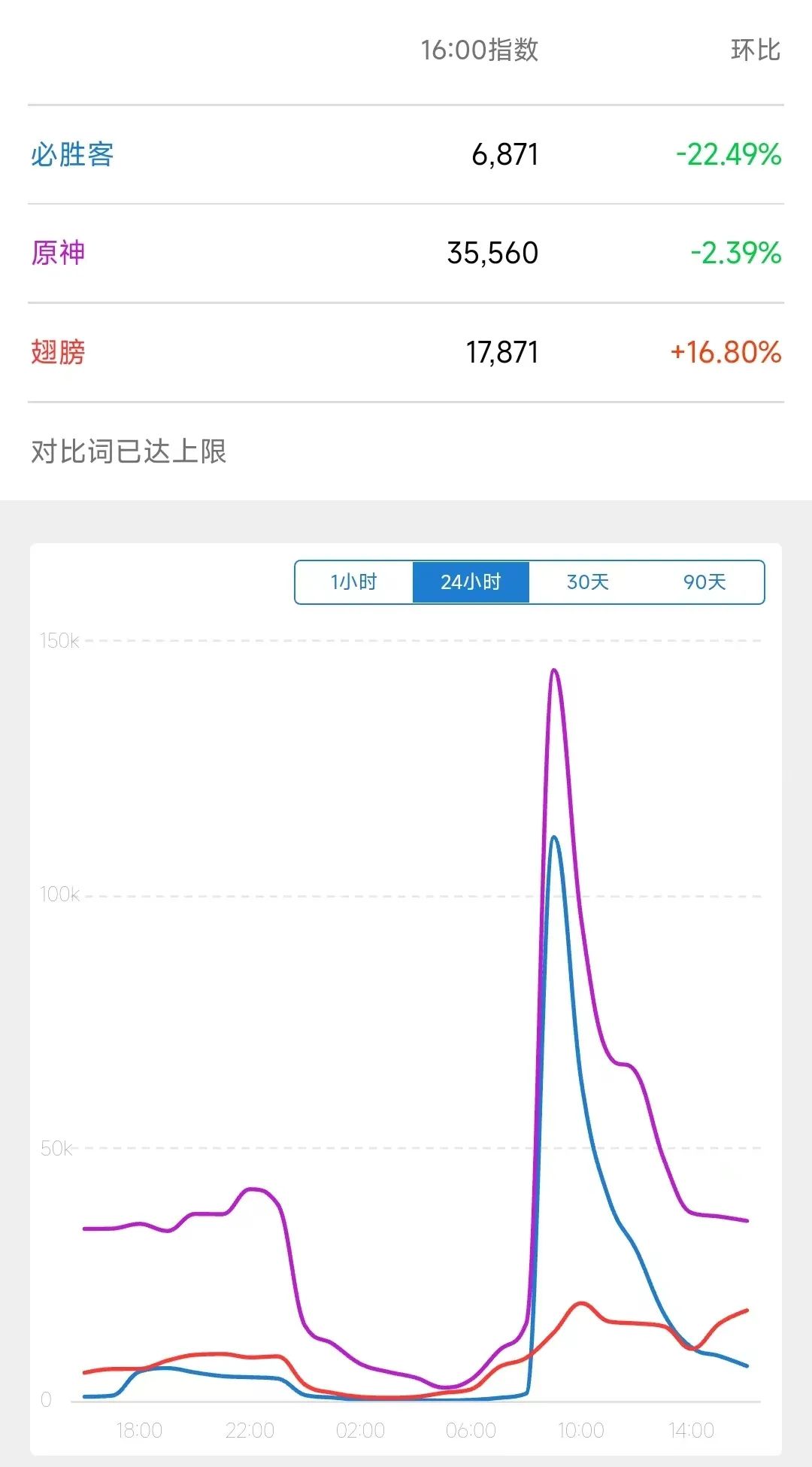 △27号下午4时,微博指数显示:“翅膀”一词也随着“原神”“必胜客”热度增加。