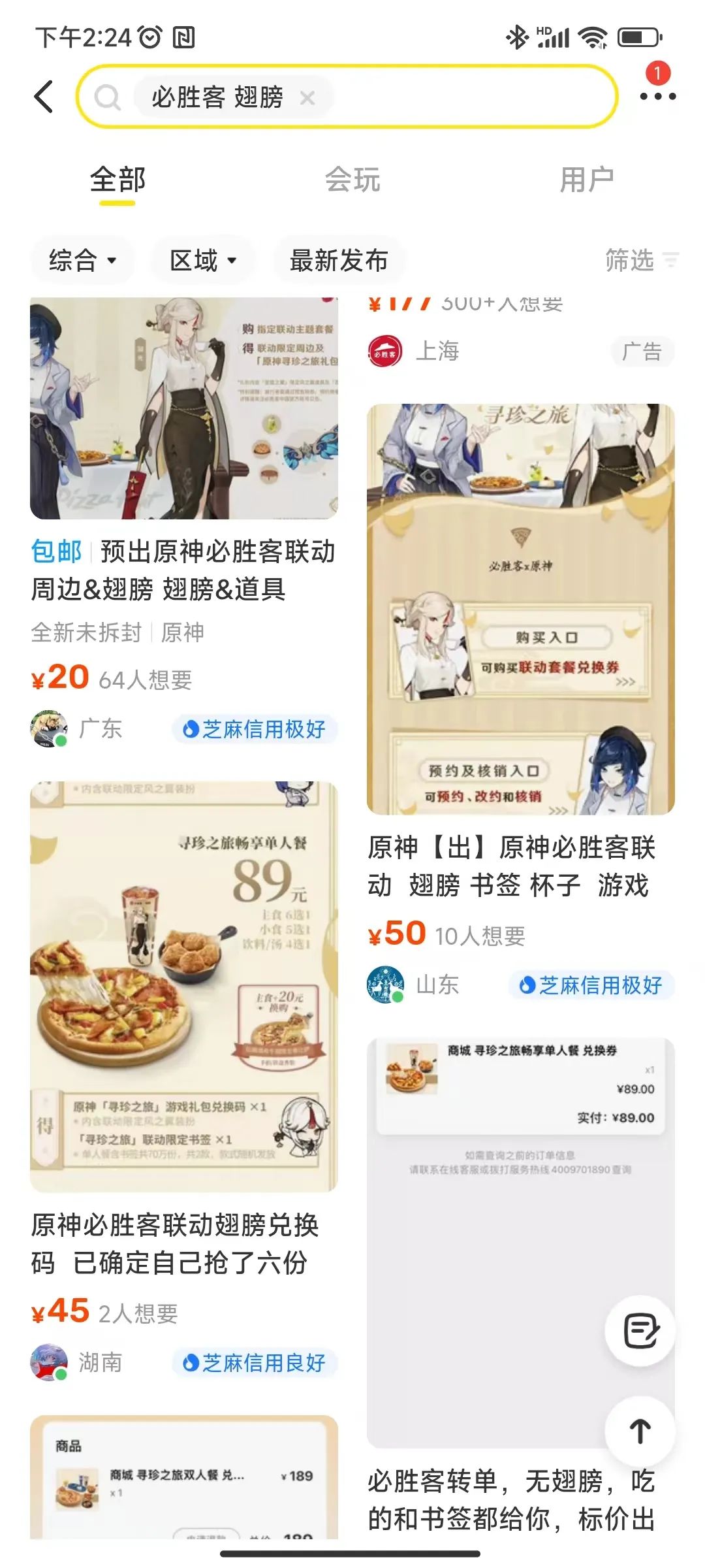 2月27号下午,我们打开某鱼APP,搜索“必胜客 翅膀”,出现了大量出售游戏道具的摊位。其中一位卖家称“自己抢了6份”。