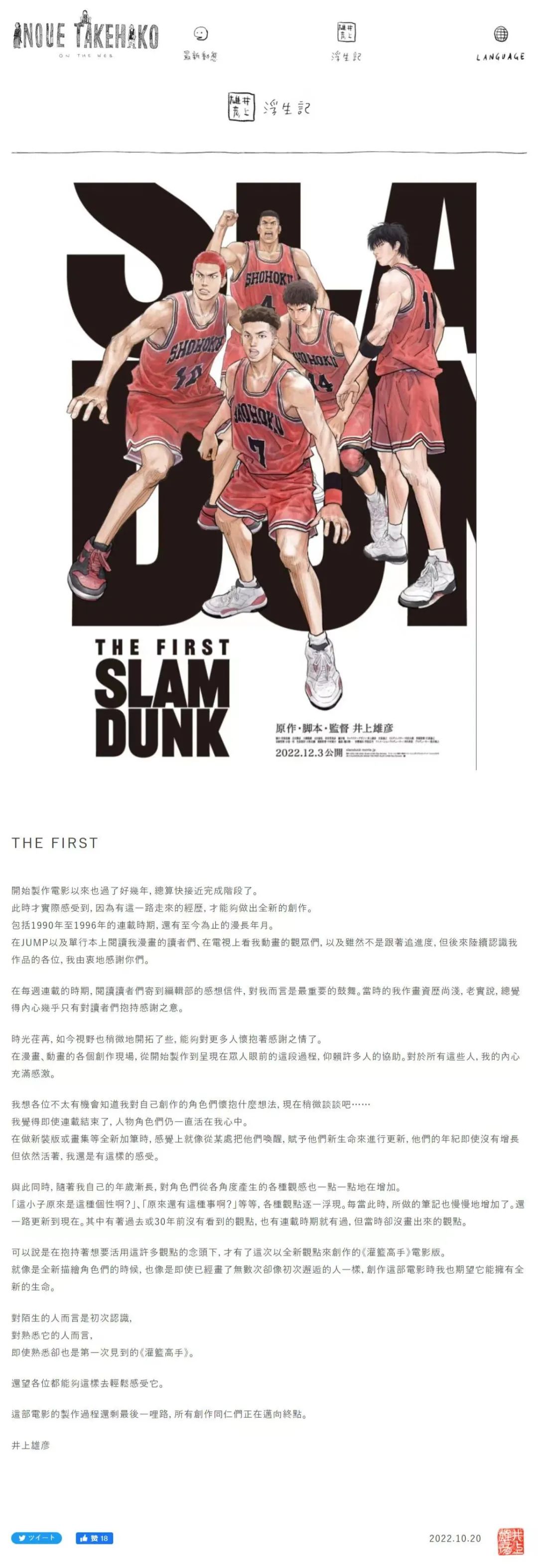 文章引用了作为电影监督的井上雄彦公开发布的感言,“随着我自己的年岁渐长,对角色们从各角度产生的各种观感也一点一点地在增加。……其中有着过去或30年前没有看到的观点,也有连载时期就有过,但当时却没画出来的观点。……创作这部电影时我也期望它能拥有全新的生命。”这封感言解释了电影的创作出发点,无论是如粉丝期望的电影中的比赛是湘北打山王,以及将漫画中甚少触笔的宫城良田作为电影版主角的原因,都是希望给与这部电影“新的生命”,“对熟悉它的人而言,即使熟悉也是第一次见到的《灌篮高手》”。