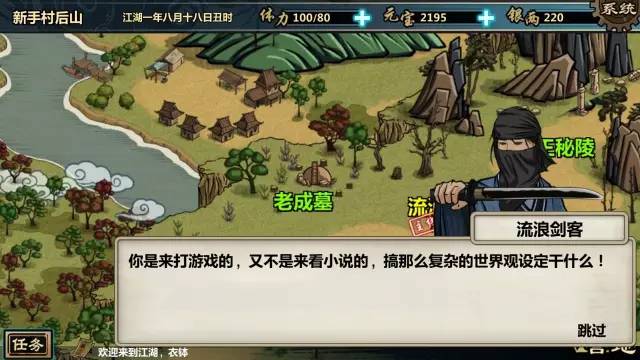 在单机市场,越是系列大作越将“剧情”视为游戏核心乃至唯一,相反在联网游戏中,以剧情和世界观给玩家留下深刻印象的游戏则少之又少。在汉家松鼠工作室推出的《江湖X》中,制作者就加入了一句吐槽通过NPC之口进行反讽:“你是来打游戏的,还是来看小说的?”